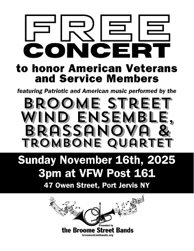 We will perform a concert of patriotic and American music on Sunday, November 16th at VFW Post 161 in Port Jervis beginning at 3pm. Brassanova and the trombone quartet will also perform a few songs.